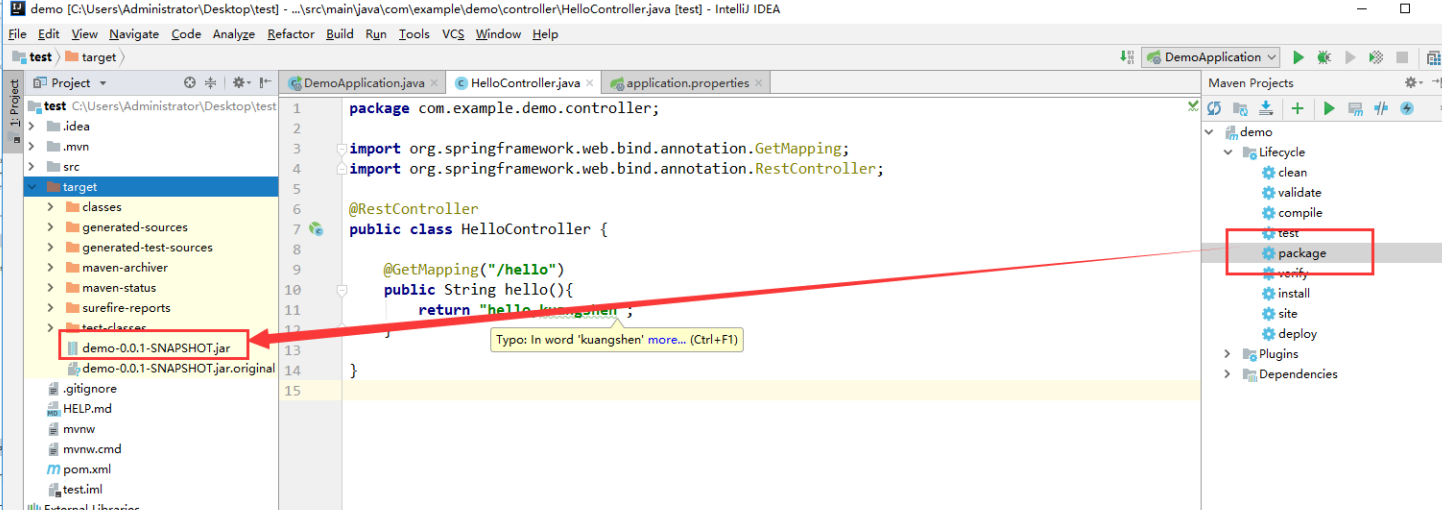 2、编写一个helloController@RestController public class HelloController {    @GetMapping("/hello")    public String hello()   {        return "hello,kuangshen";    } }   3、启动测试下,端口修改下,避免8080冲突!本地访问没问题就可以!